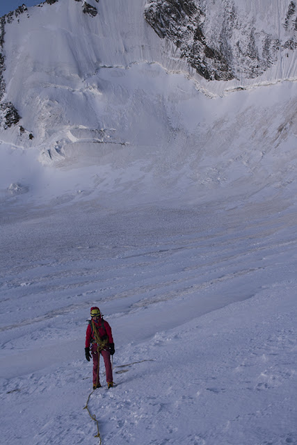 Szerencsénk ? Nem, a fogalmazás rossz, inkább jó tervezést lehetne mondani. Már kétszer próbáltuk Yvonne-al az útvonalat - egyszer késő ősszel, egyszer kora tavassszal - , és a rossz tervezés, megtámogatva a rossz hóviszonyokkal, nem igazán hozott eredményt. Most csak a kis gleccser a bizonytalan tényező, mert a topo szerint ez nyár végén okozhat problémát. Fel vagyunk készülve rá - kinél hágóvas, kinél jégcsákány - de elég egy pillantás a széles, hóborította jégmezőre ahhoz, hogy meggyőződjek - ez nem lesz gond. Meg nagyon kicsi a mérete, inkább egy örörk hómező, mint gleccser, mindössze 10 percbe kerül a keresztezése, és repedéseknek, gyanús formáknak nyoma sincs... A reggeli nap melegében megolvadt hótakarót széles nyomsáv keresztezi egy másik irányból.